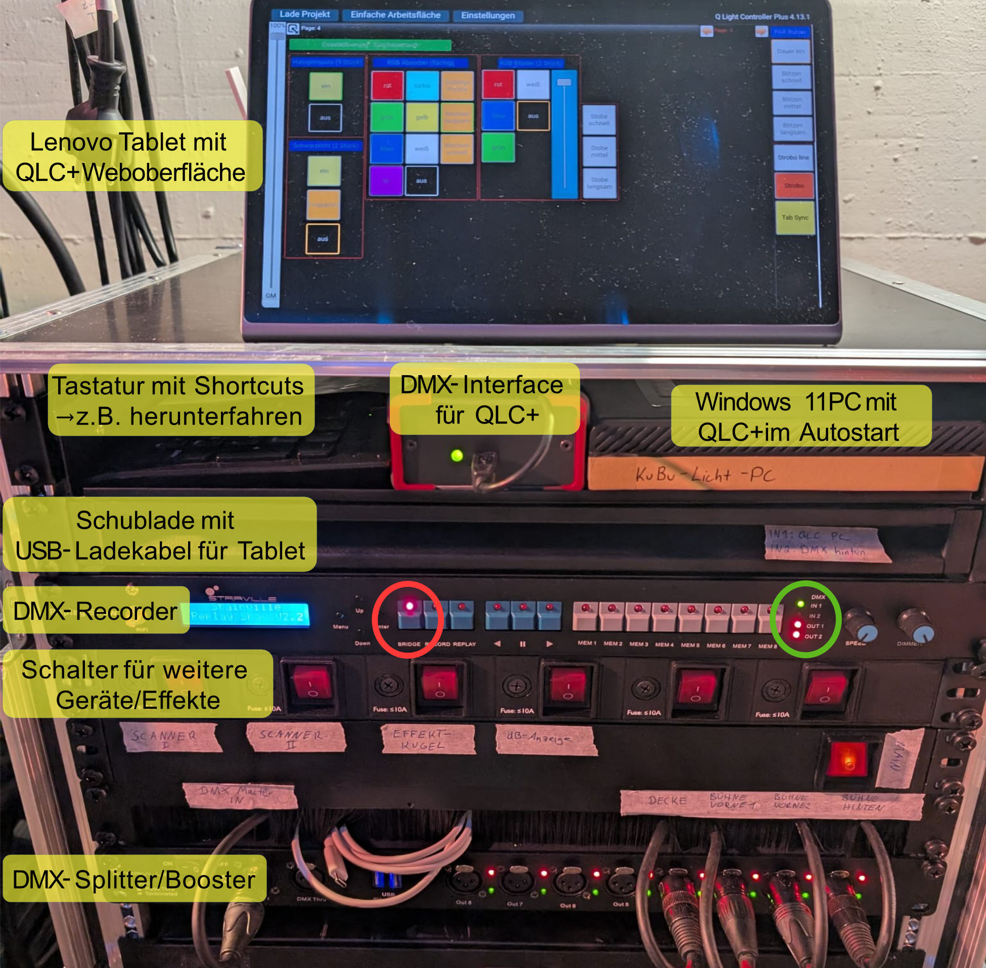 Dies geht nicht über die Weboberfläche oder über die Power-Taste am PC (QLC+ verhindert den Shutdown). Daher gibt es einen Tastatur-Shortcut: '+' auf dem Numpad.